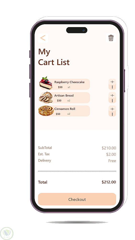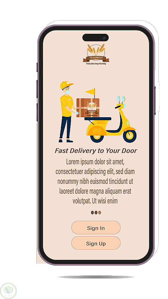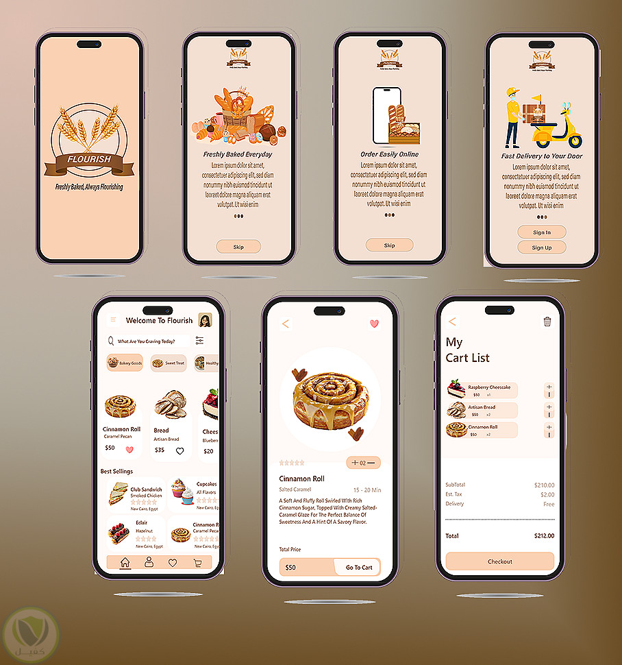 تطبيق أنيق وسهل الاستخدام لطلب منتجات المخبز عبر الإنترنت. التصميم يركز على عرض المنتجات بشكل جذاب من خلال صور عالية الجودة، وألوان دافئة تعكس هوية المخبز، مع تجربة شراء سلسة.