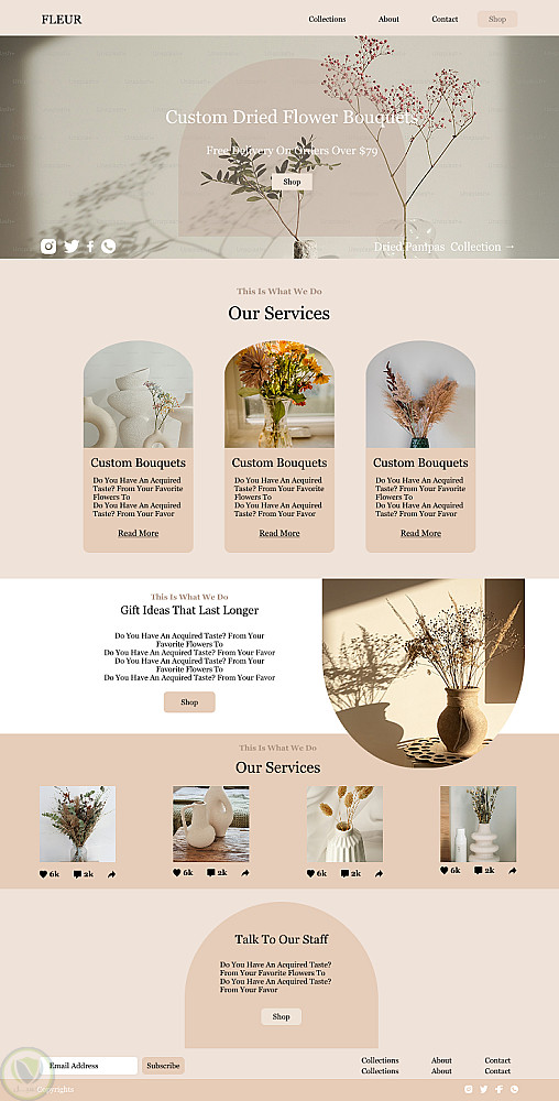 تصميم صفحة هبوط أنيقة لعلامة متخصصة في باقات الزهور المجففة. ركّزت فيها على ألوان هادية وتفاصيل ناعمة تعكس الطابع الطبيعي والراقي للمنتج، مع توزيع مريح للعناصر وتجربة مستخدم بسيطة وسلسة.