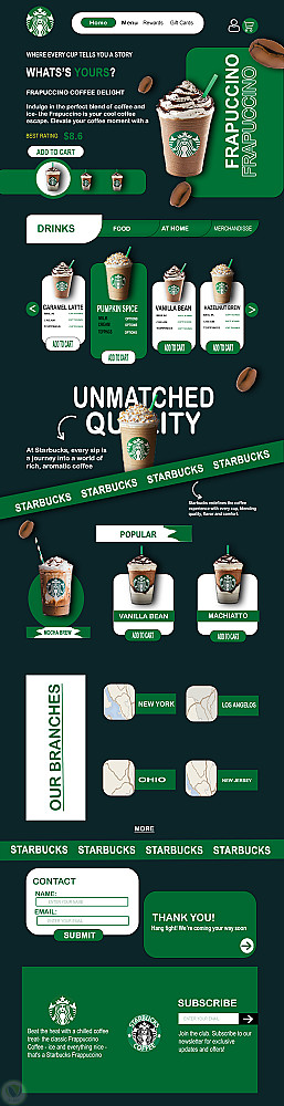هذا تصميم تجريبي لواجهة موقع إلكتروني مستوحى من علامة ستاربكس، يركز على عرض منتجات القهوة بطريقة عصرية وجذابة. يحتوي التصميم على أقسام للمنتجات، التصنيفات، فروع المتاجر، ونموذج للتواصل. اعتمد التصميم على ألوان العلامة المميزة (الأخضر × الأسود) لإبراز الهوية البصرية وتقديم تجربة متجر إلكتروني منظمة وعصرية.