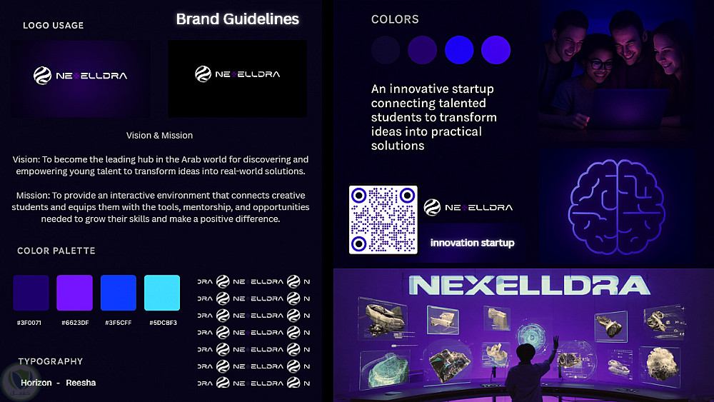 تم تصميم الهوية البصرية الكاملة لشركة Nexelldra، وهي شركة ناشئة مبتكرة تجمع بين التقنية والإبداع، وتهدف إلى تمكين الشباب الموهوبين من تطوير حلول لمشكلات المجتمع والعالم.