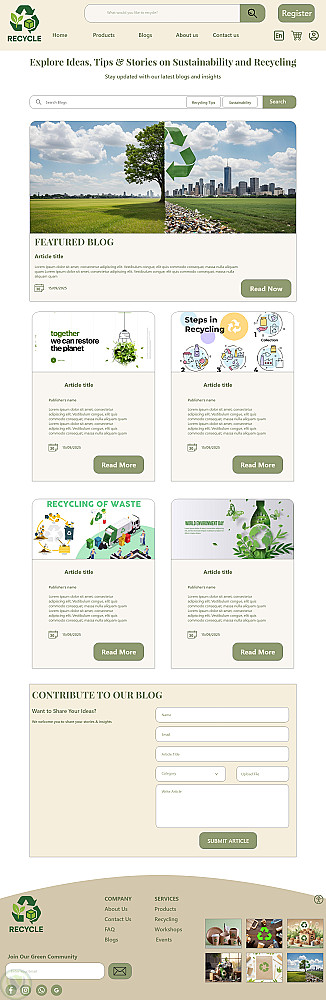 موقع إلكتروني متكامل لشركة متخصصة في إعادة تدوير المواد مثل الورق والبلاستيك. يهدف التصميم إلى نشر الوعي البيئي وتشجيع المستخدمين على المشاركة من خلال التبرع بالمواد أو المساهمة المالية، مع إمكانية شراء منتجات معاد تدويرها عبر المنصة.