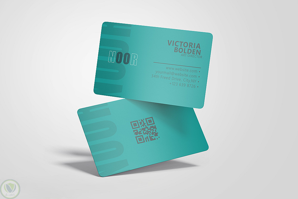 التصميم يعتمد على أسلوب Minimalistic مع ألوان متناسقة، خط واضح، ودمج عنصر بارز (اسم NOOR بشكل متكرر كـ Pattern على جانب الكارت).