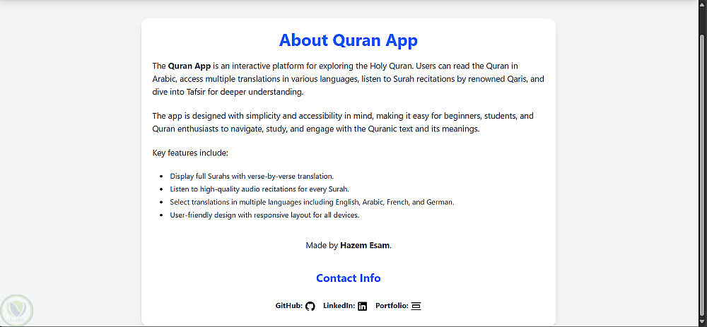 تطبيق القرآن هو منصة تفاعلية لاستكشاف القرآن الكريم، حيث يمكن للمستخدمين قراءة القرآن باللغة العربية، والوصول إلى ترجمات متعددة بلغات مختلفة، بالإضافة إلى الاستماع إلى تلاوات السور بصوت قرّاء مشهورين.