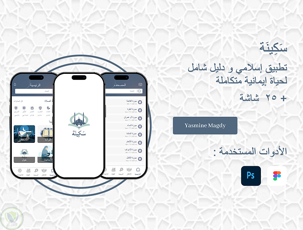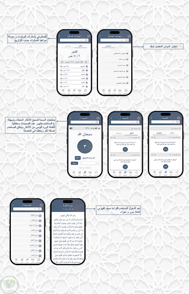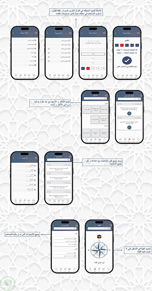 تم تصميم التطبيق بواجهة حديثة وألوان مستوحاة من الطابع الإسلامي لتمنح المستخدم شعورًا بالسكينة والتركيز أثناء الاستخدام.