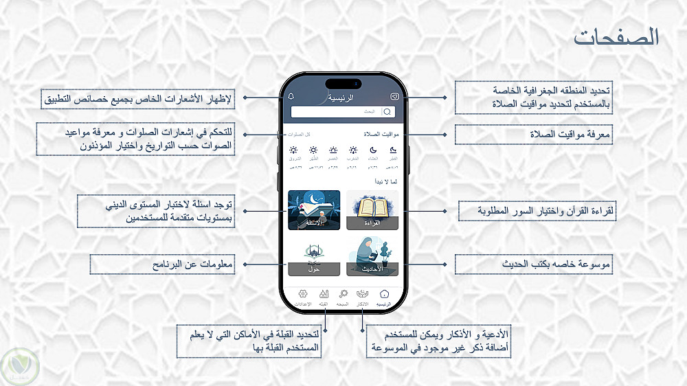 يوفر التطبيق القرآن الكريم كاملًا مع التلاوة الصوتية والتفسير، بالإضافة إلى الأذكار اليومية، مواقيت الصلاة، وتنبيهات الأذان في الوقت الحقيقي.