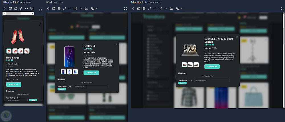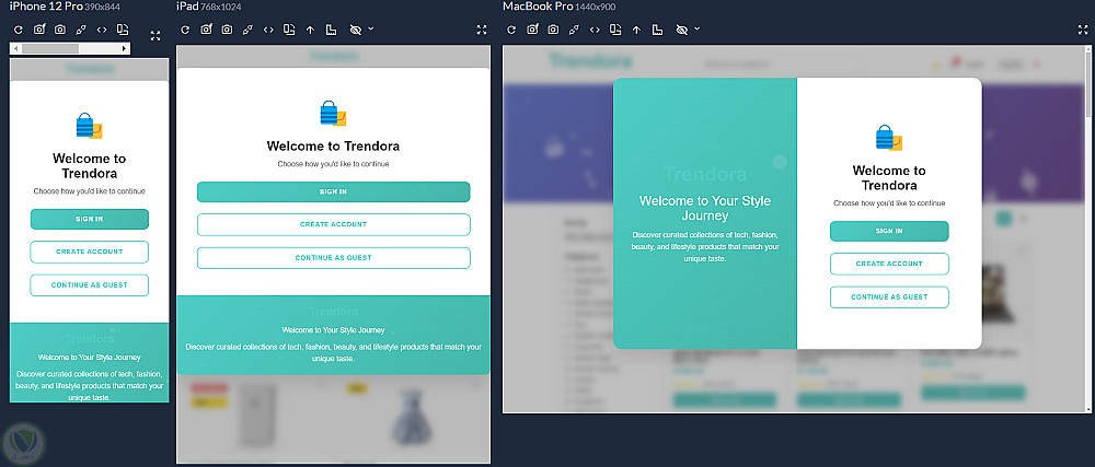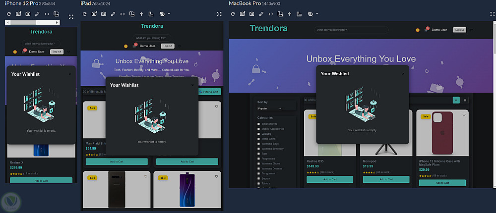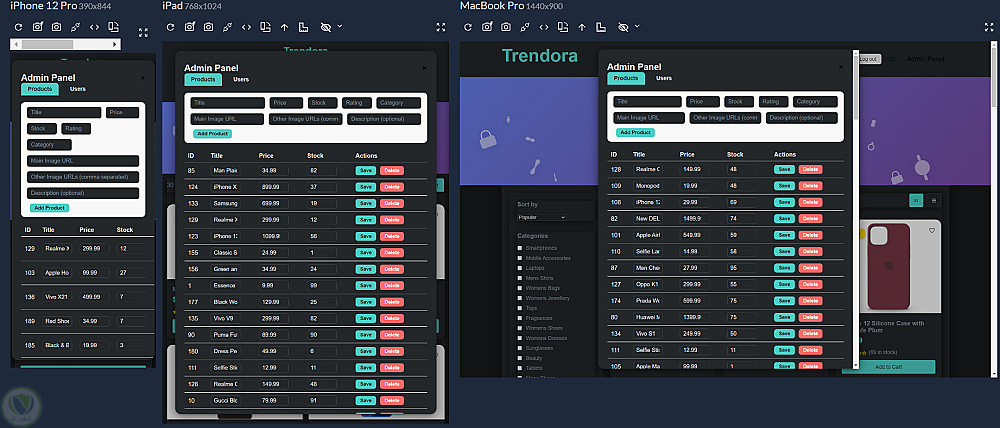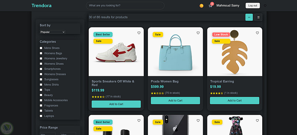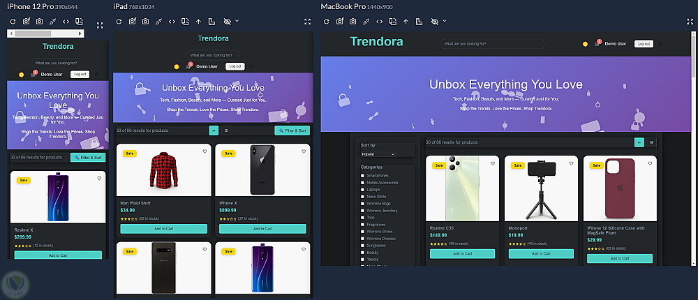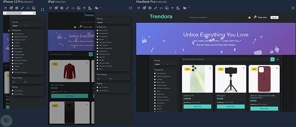 تطبيق متجر إلكتروني تفاعلي Trendora مبني بالكامل بـ Vanilla JavaScript (بدون أطار عمل). يقدم بحث لحظي مع إكمال تلقائي ودعم لوحة المفاتيح، تصفية متقدمة (فئة/سعر/تقييم)، وتبديل بين العرض الشبكي والقائم. يحتوي على عربة ومفضلة مع مؤثرات مرئية، نظام تقييمات ومراجعات، لوحة تحكم للمشرف (واجهة)، وأنماط تسجيل (ضيف/مستخدم/مشرف على الواجهة). يدعم الوضع الداكن/النهاري مع حفظ التفضيلات، وتصميم متجاوب لسطح المكتب والموبايل، ويتضمن نموذج شراء تجريبي وتجربة مستخدم سلسة وقابلة للتخصيص.