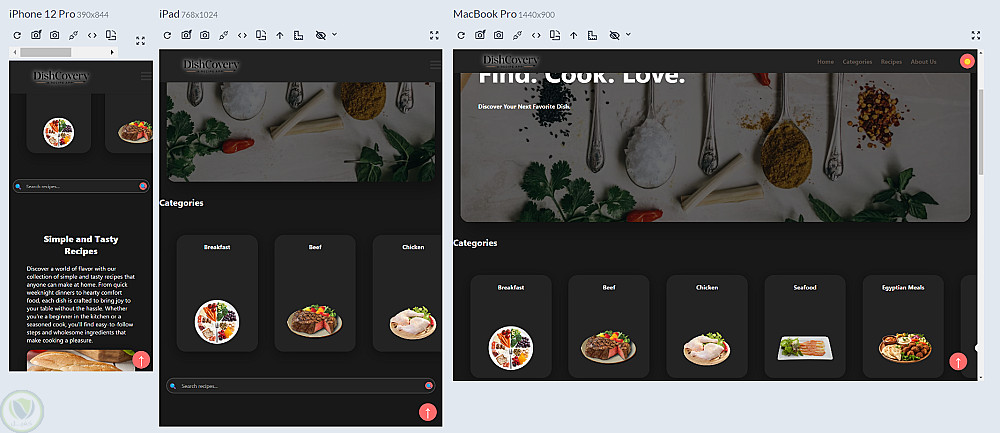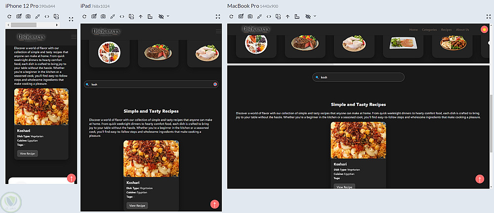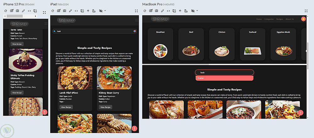 طوّرت تطبيق ويب تفاعلي وحديث لاكتشاف وصفات من مختلف دول العالم باسم DishCovery، باستخدام JavaScript فقط (بدون أي إطار عمل). يتميز بواجهة جذابة ومتجاوبة بالكامل، مع تجربة سلسة على جميع الأجهزة.
