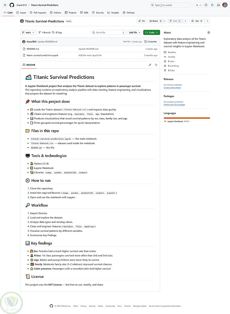 مشروع Jupyter Notebook لتحليل بيانات Titanic بهدف استكشاف أنماط نجاة الركاب.