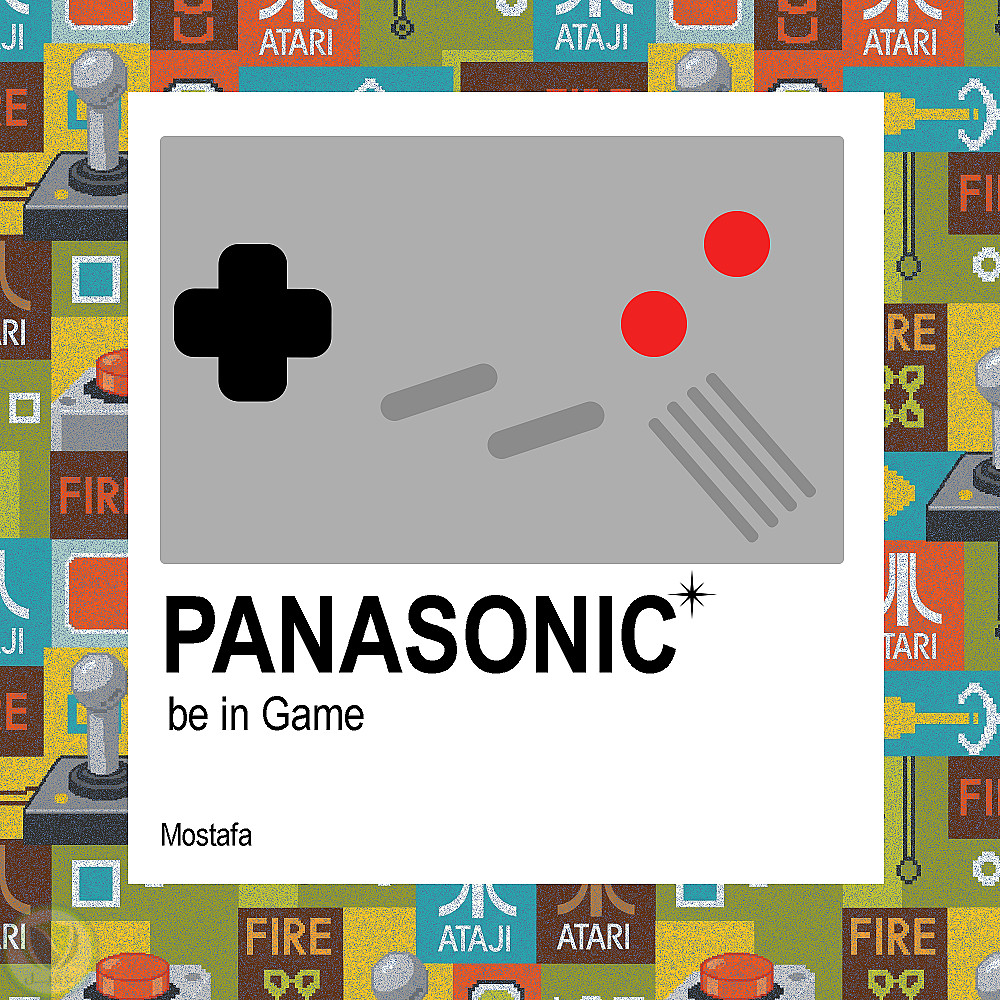 يعرض التصميم واجهة تحاكي يد تحكم الألعاب القديمة بتفاصيل بسيطة وألوان متناسقة، مع دمج شعار PANASONIC وشعار تسويقي مبتكر "be in Game" ليعبر عن الاندماج في عالم الألعاب الإلكترونية.