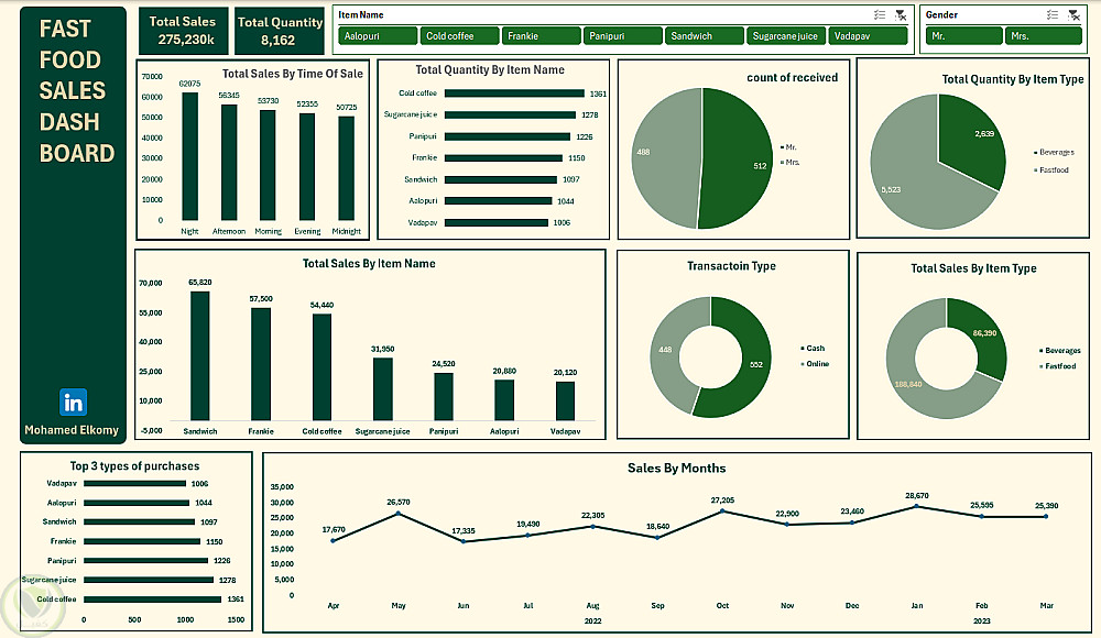 بدأ المشروع بهدف تحليل أداء المبيعات في مطعم وجبات سريعة عبر تحويل بيانات خام غير منظمة إلى لوحة تفاعلية احترافية على Excel.