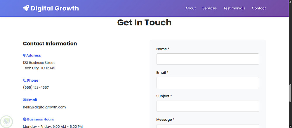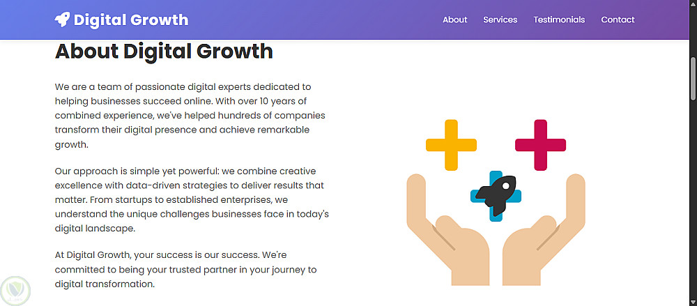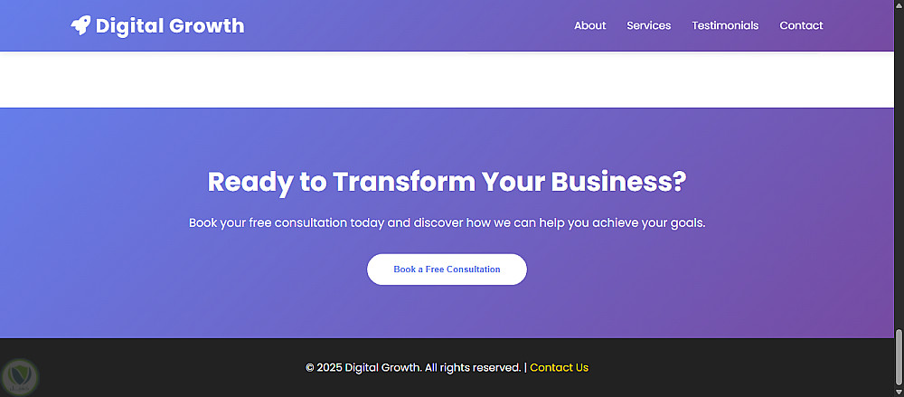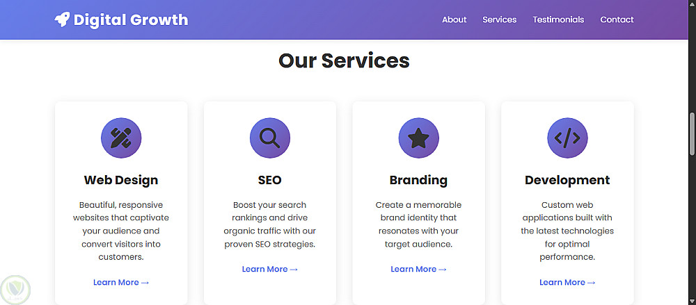 تصميم وتطوير موقع تعريفي احترافي لشركة تقدم خدمات رقمية مثل تصميم الويب، وتحسين محركات البحث (SEO)، والعلامة التجارية، وتطوير التطبيقات. الموقع يتكوّن من أقسام رئيسية تشمل: مقدمة، نبذة عن الشركة، الخدمات، آراء العملاء، نموذج تواصل، وتذييل يحتوي على بيانات الاتصال. تم استخدام تصميم عصري متجاوب بألوان متدرجة وأيقونات واضحة تعكس الطابع التقني للشركة.