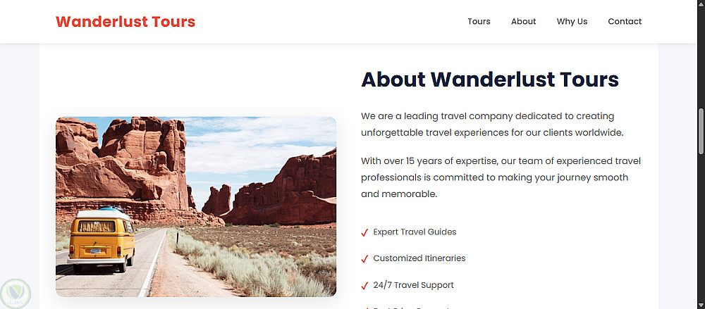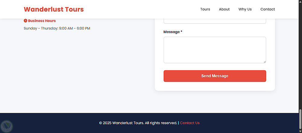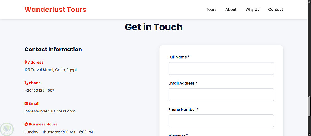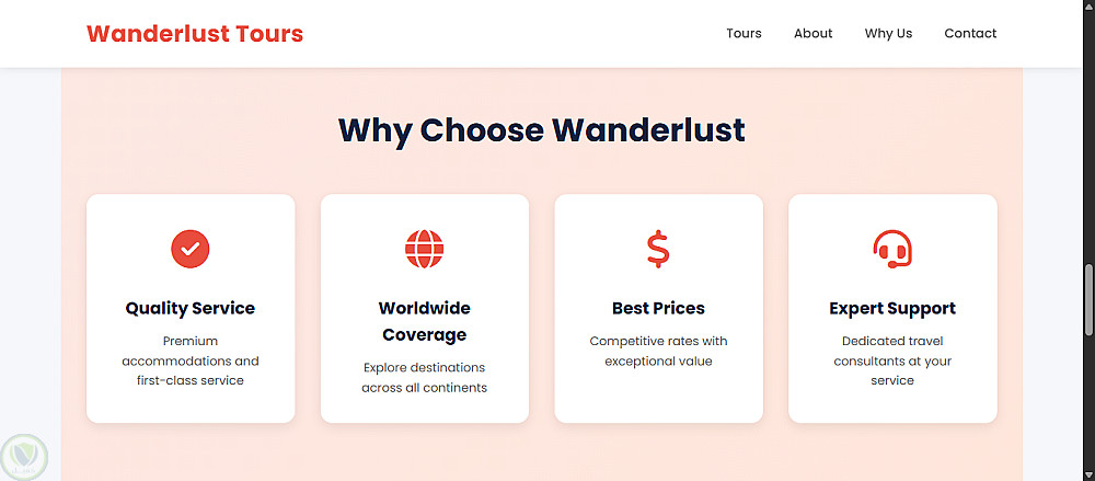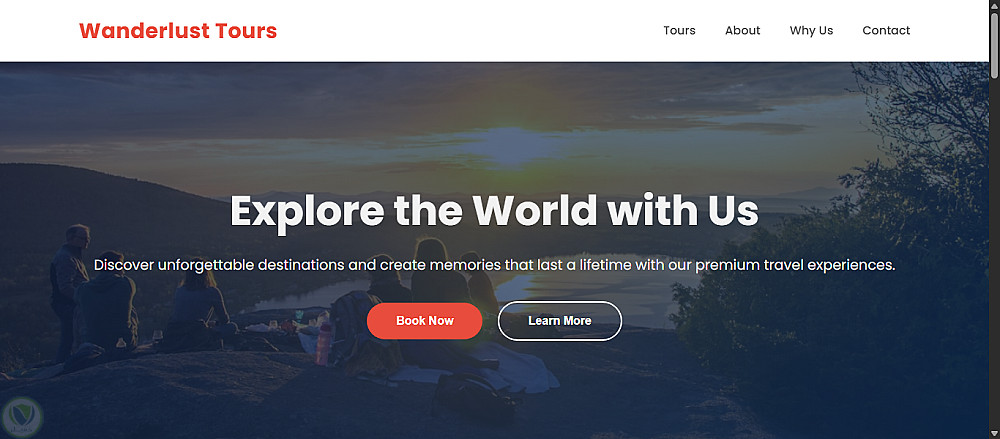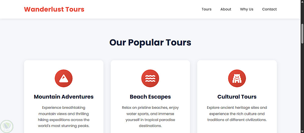 تصميم واجهة موقع تعريفي لشركة سياحة وسفر تُقدّم تجارب سفر مميزة حول العالم. يحتوي الموقع على أقسام رئيسية مثل: الجولات الأكثر شعبية، نبذة عن الشركة، لماذا تختارنا، ونموذج تواصل. تم اعتماد تصميم عصري بألوان دافئة (أحمر وبرتقالي) وصور واقعية تعكس روح المغامرة والسفر.