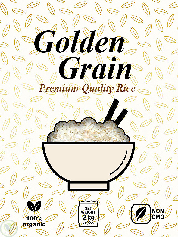 قمت بتصميم عبوة أنيقة وعصرية لمنتج أرز جولدن جراين الفاخر. يبرز التصميم الجودة الطبيعية والعضوية للمنتج من خلال الرسومات البسيطة ولوحة الألوان الهادئة مع عرض واضح للمعلومات (عضوي 100٪، غير معدل وراثيًا، والوزن الصافي). كما يضيف رسم الوعاء المليء بالأرز لمسة شهية وجذابة لجذب المستهلكين.