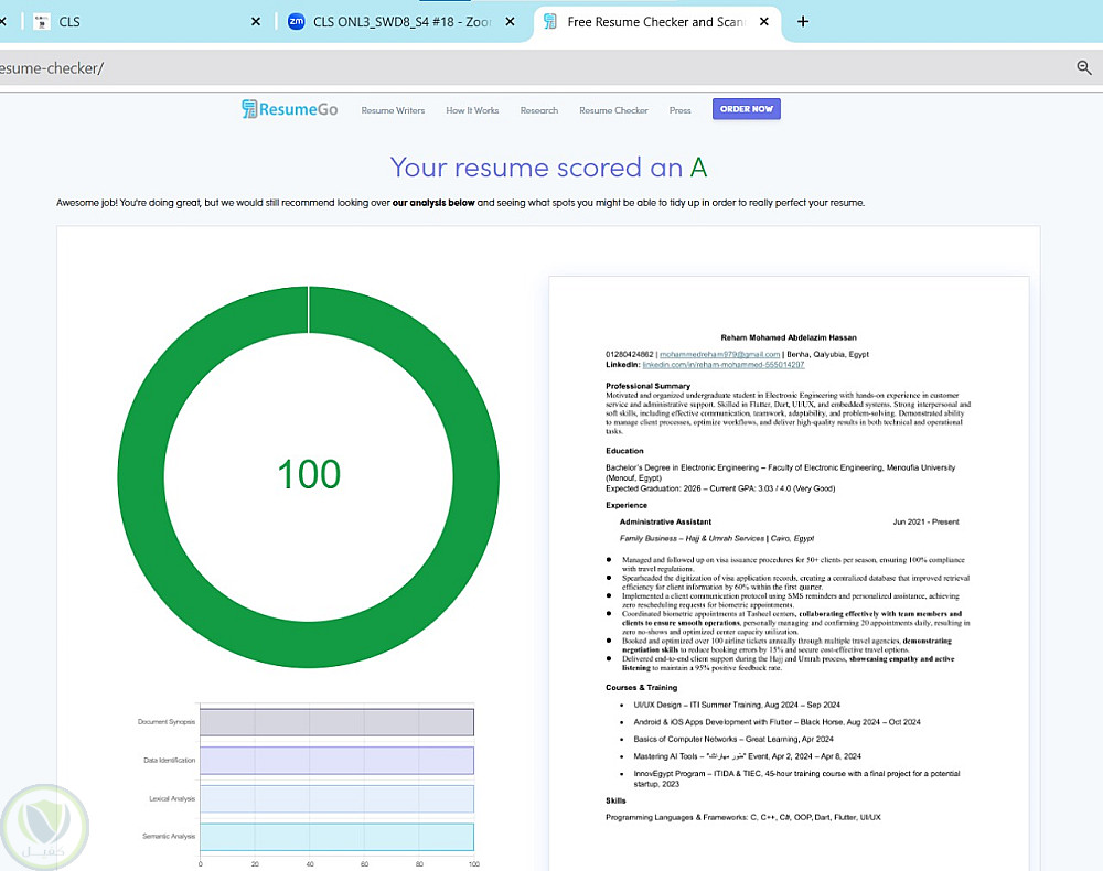 قمت بتصميم سيرة ذاتية احترافية بالكامل مع تنسيق متوافق مع ResumeGo لتحقيق تقييم 100/100.