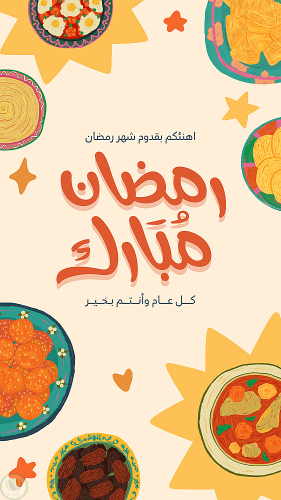 يتميز التصميم برسومات يدوية مستوحاة من المأكولات الرمضانية التقليدية، مع استخدام خطوط عربية واضحة ونص تهنئة بسيط: