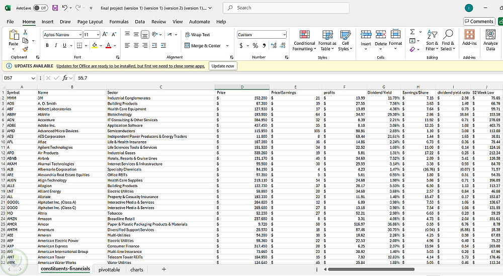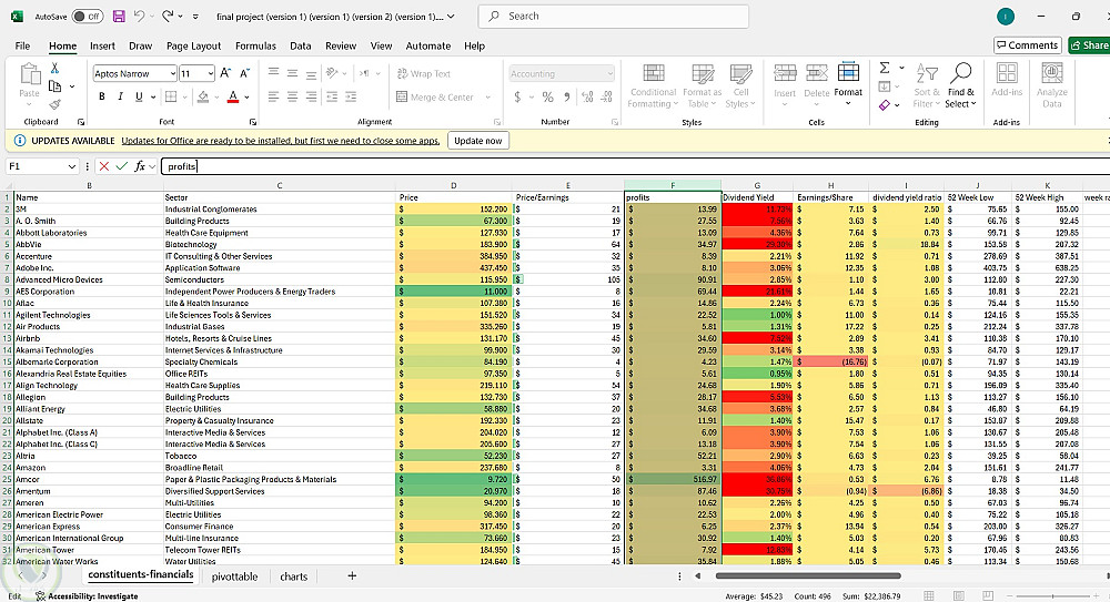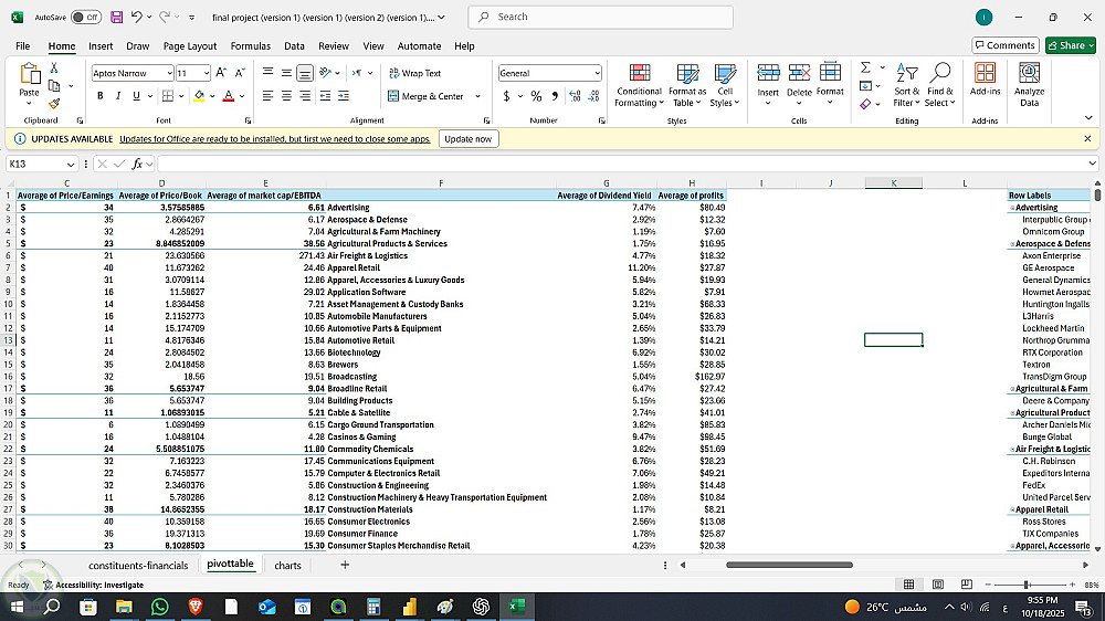 يهدف هذا المشروع إلى تحليل البيانات المالية لمجموعة من الشركات الأمريكية باستخدام أدوات Excel المتقدمة مثل الجداول المحورية (PivotTables) والرسوم البيانية (Charts)، بهدف استخلاص مؤشرات مالية مهمة تساعد على تقييم أداء الشركات ومقارنة القطاعات المختلفة.