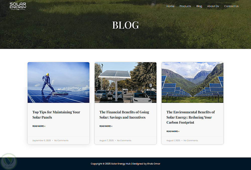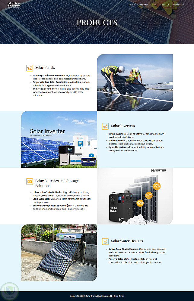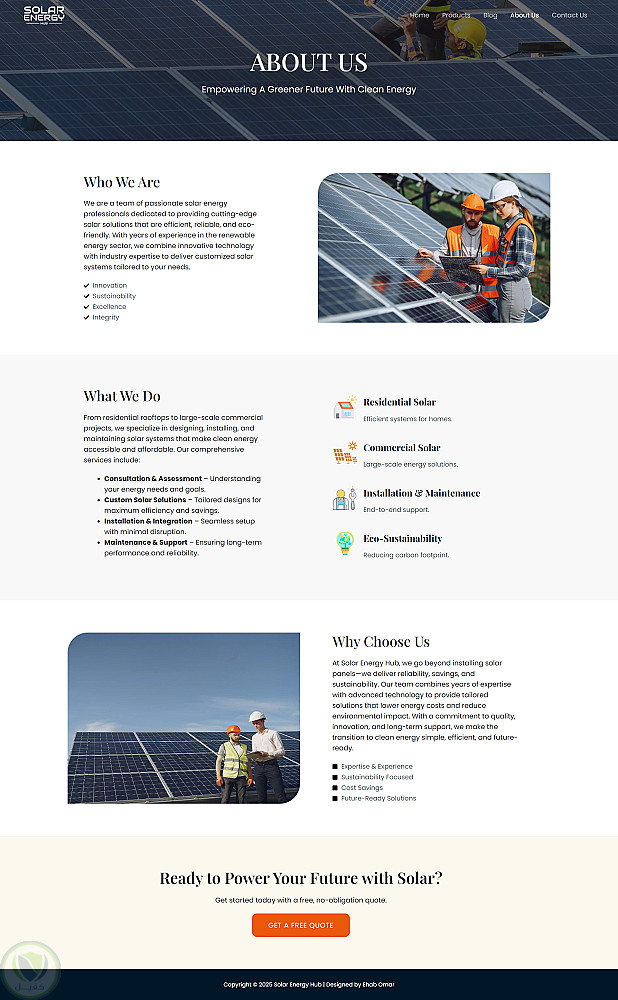 تم إنشاء واجهة رئيسية جذابة بصور من المشاريع، وصفحة منتجات منظمة لعرض حلول الطاقة الشمسية، وصفحة مدونة لأحدث المقالات حول الطاقة النظيفة، وصفحة "من نحن" تبرز رؤية ورسالة الشركة، وصفحة "اتصل بنا" مزودة بنموذج تواصل فعال.