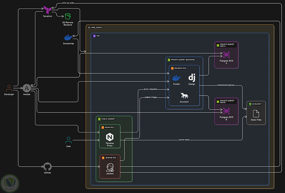 تم تحزيم تطبيق Django داخل حاويات Docker، رفع الصور إلى Docker Hub، ونشرها على خوادم EC2 مع دمج Nginx وS3 لتخزين الملفات الثابتة بشكل آمن.