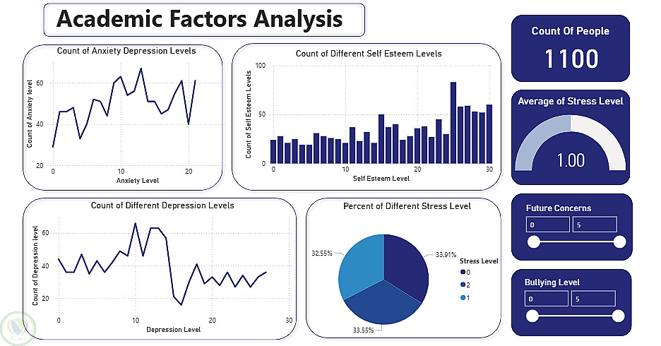 مت معالجة البيانات باستخدام Microsoft Excel ثم تصميم داشبورد تفاعلي باستخدام Microsoft Power BI لتحليل مستويات الضغط النفسي لدى الطلاب ودراسة تأثير عوامل مثل القلق، الاكتئاب، تقدير الذات، التنمر والمخاوف المستقبلية.