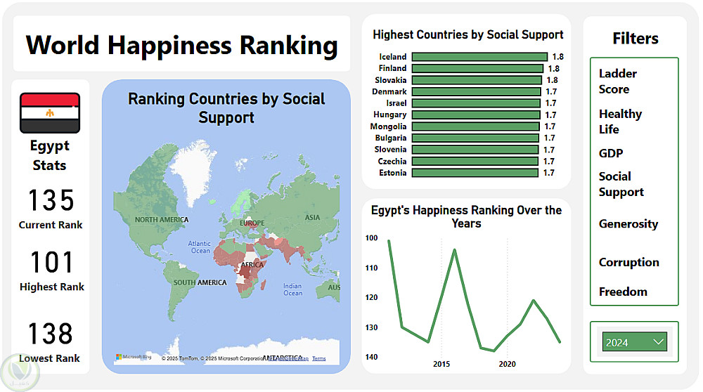 لوحة تفاعلية (Dashboard) لمؤشر السعادة العالمي مع تحليل وضع مصر