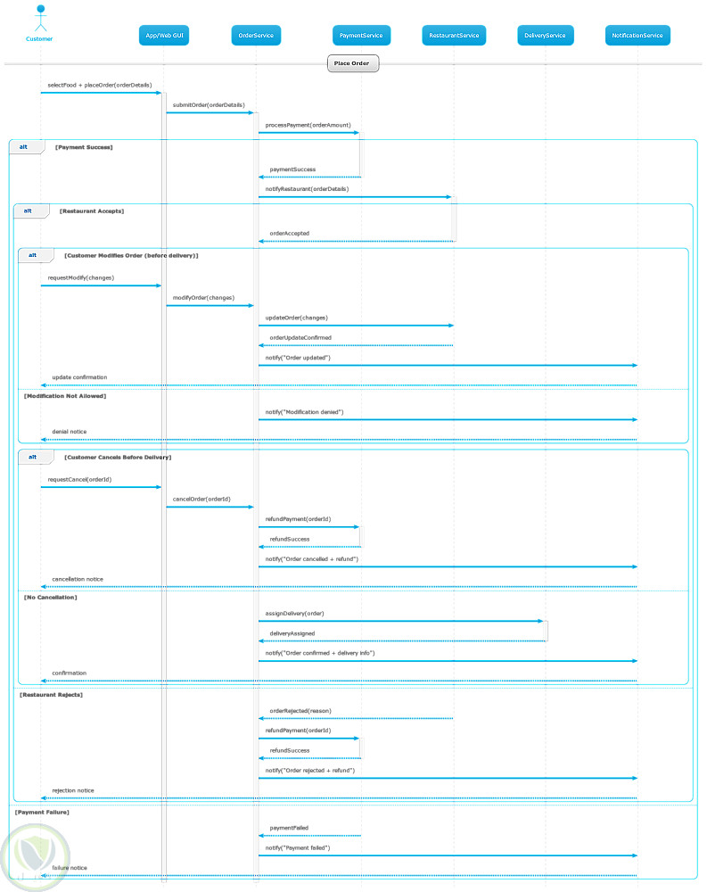 Sequence Diagram – مخطط تسلسل التفاعل لتطبيق توصيل الطعام