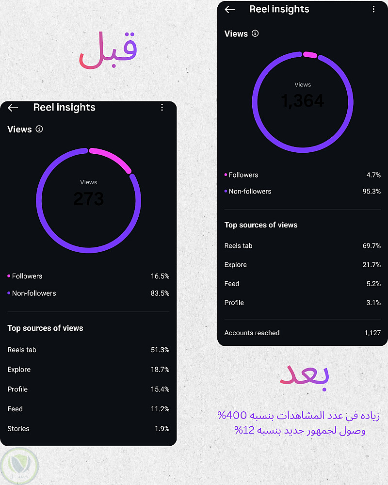 نموذج يوضح الفرق بعد استخدام خطه محتوى معين و تحديد افكار معينه للريل زادت نسبه المشاهدات ٤٠٠ % و الظهور لغير المتابعين ل ١٢%
