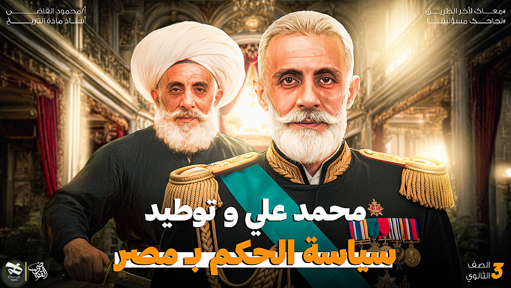 تصميم فني يجسد مشهدًا دراميًا من حقبة محمد علي باشا، حيث يتحول الفصل الدراسي إلى لوحة تاريخية نابضة بالحياة. يظهر المعلم في هيئة محمد علي باشا مرتديًا الزي الرسمي العثماني، يشرح لتلاميذه عن سياسة الحكم وبناء الدولة الحديثة في مصر.