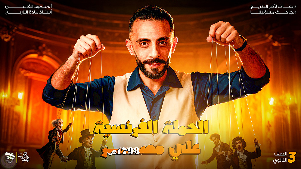 -تصميم فني بأسلوب درامي يجمع بين التعليم والإبداع البصري، يُظهر أستاذ التاريخ في هيئة المايسترو الذي يتحكم بخيوط العرض ليحكي تفاصيل الحملة الفرنسية على مصر عام 1798 بطريقة مشوقة.