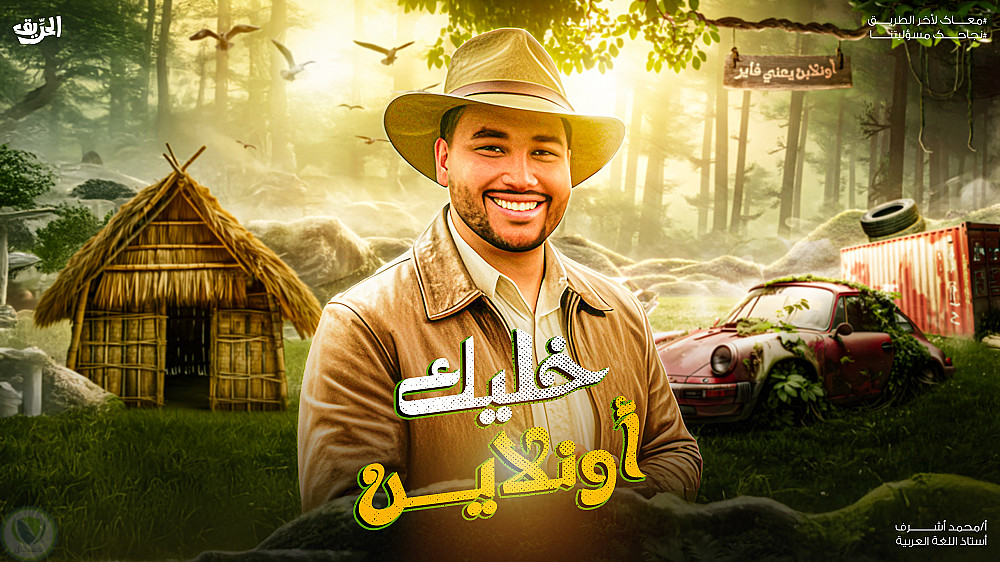 تصميم إعلاني مميز يظهر فيه شاب مبتسم يرتدي قبعة وجاكيت من الجلد، يقف في غابة مليئة بالحياة والنور الصباحي، وخلفه كوخ خشبي وسيارة قديمة مغطاة بالنباتات. في أعلى الصورة لافتة مكتوب عليها "أونلاين يعني فاهم"، تعبيرًا عن فكرة أن التعليم عبر الإنترنت يمنح الطالب تجربة مختلفة مليئة بالاكتشاف والمعرفة.