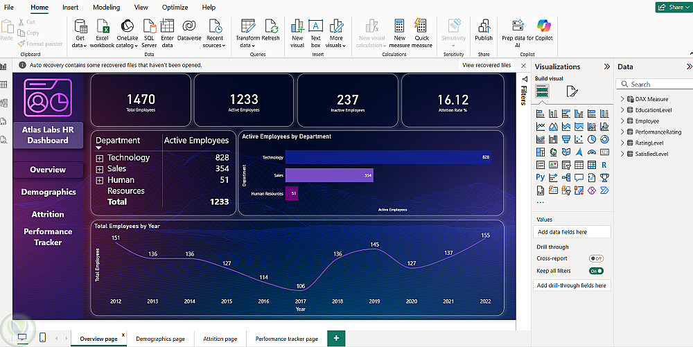 نظرة عامة (Overview): عدد الموظفين الإجمالي، النشطين، ومعدل ترك الخدمة (Attrition).