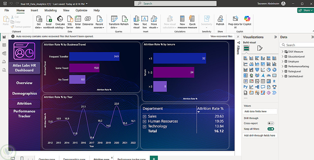 تحليل معدل ترك الخدمة (Attrition): تحليل المعدل حسب القسم، السنة، مدة الخدمة، وكثافة السفر.