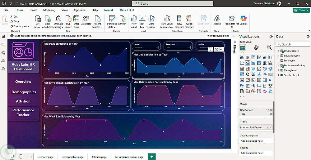 تتبع الأداء (Performance Tracker): تتبع مؤشرات الرضا الوظيفي، رضا العلاقات، تقييم المديرين، وتوازن الحياة العملية على مر السنين.