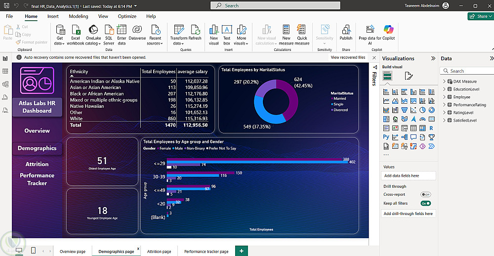 البيانات الديموغرافية (Demographics): توزيع الموظفين حسب العمر، الجنس، الحالة الاجتماعية، والعرق.