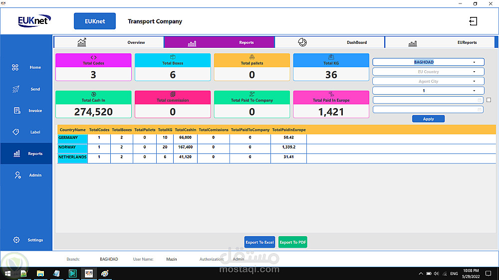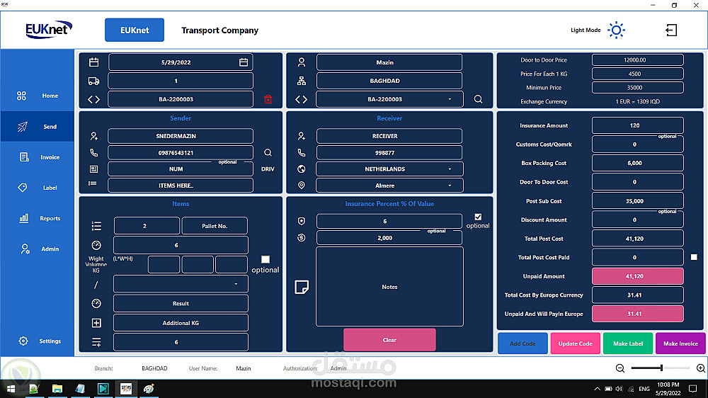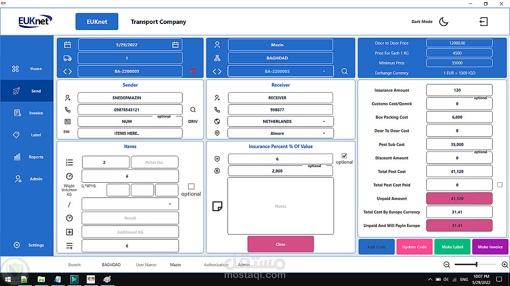 تطبيق سطح مكتبي لشركة شحن واستيراد بضائع((البرنامج خاص و ملك لشركة EUKNET)) وفق المواصفات التالية :
