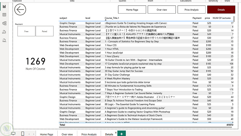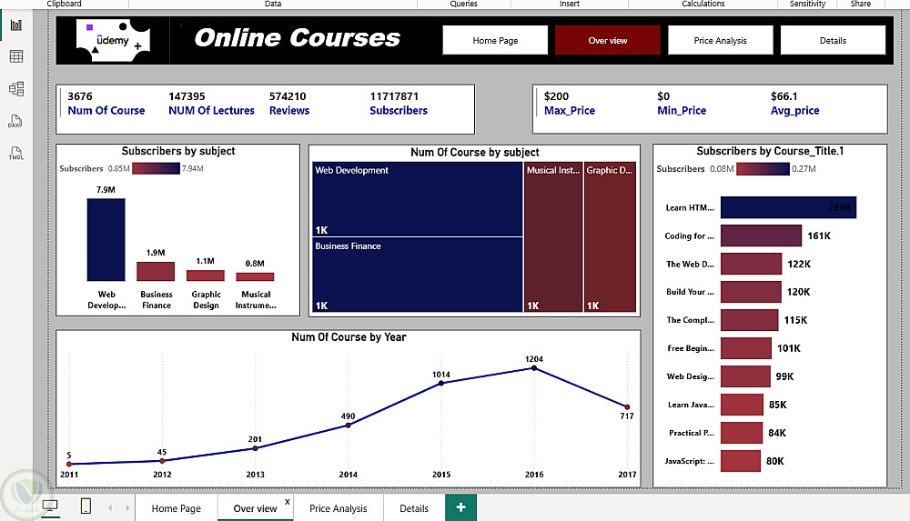 مشروع تحليل بيانات متكامل لكورسات يوديمي، بدءاً من تنظيف البيانات وتحويلها (Data Cleaning & Transformation) وحتى بناء لوحة معلومات (Dashboard) احترافية باستخدام Power BI.