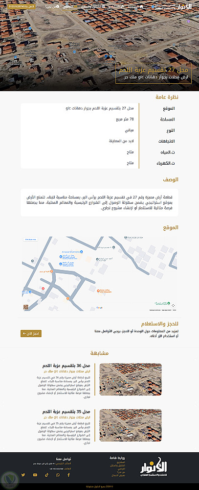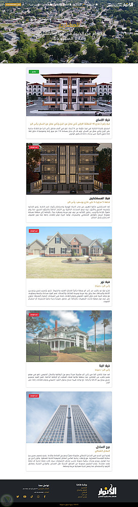 قمت بتصميم وتطوير موقع ويب عقاري متكامل لشركة الأنوار للعقارات، يهدف إلى عرض الشقق والمشاريع والأراضي بطريقة منظمة واحترافية تُسهّل على العملاء استكشاف العروض واتخاذ قرارات الشراء أو التواصل بسهولة.