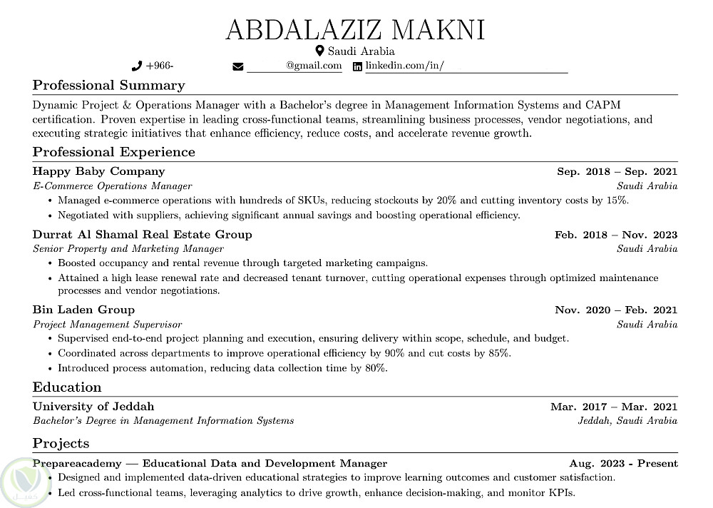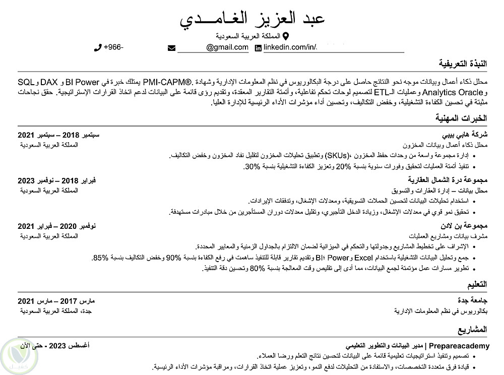إعداد سيرة ذاتية احترافية بالعربية والإنجليزية لعميل سعودي