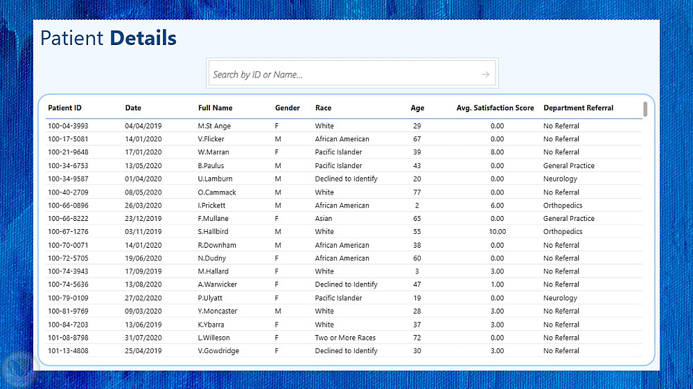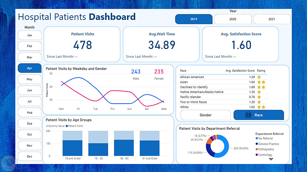 قمت بعمل داشبورد باستخدام Power BI لبيانات زيارات المرضى لمشفى خلال الأعوام من 2019 حتى 2021 معتمد على العمر والنوع والعرق بالإضافة لتقييم كل مريض لتجربته.