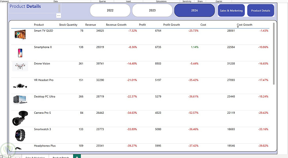 • نسب النمو أو الانخفاض لكل عنصر عبر السنوات (2022–2024)