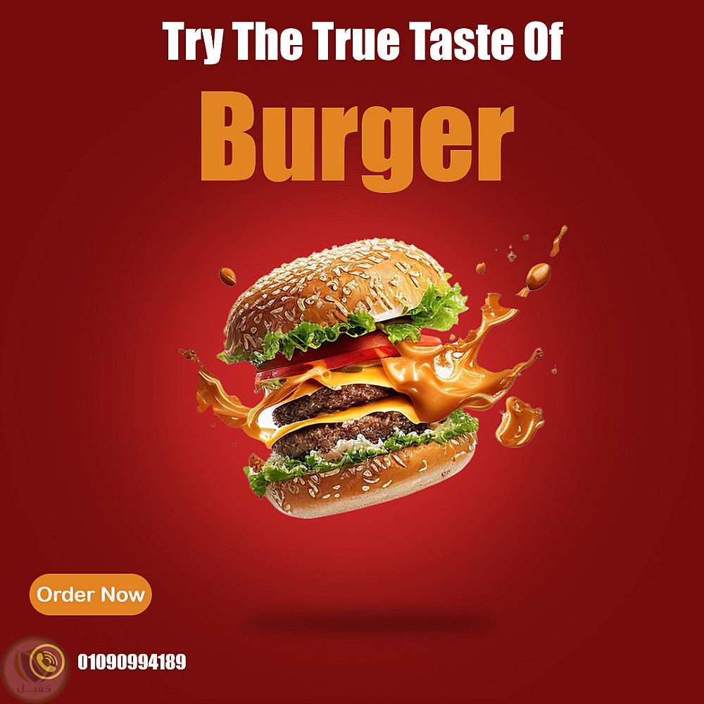 تصميم إعلان ترويجي لمنتج (برجر) لمنصات السوشيال ميديا. تم التركيز على إبراز المنتج بشكل احترافي وجذاب (Food Photography Manipulation) مع استخدام ألوان دافئة تفتح الشهية، وعبارة (Call to Action) واضحة لزيادة الطلبات بإستخدام الفوتوشوب.