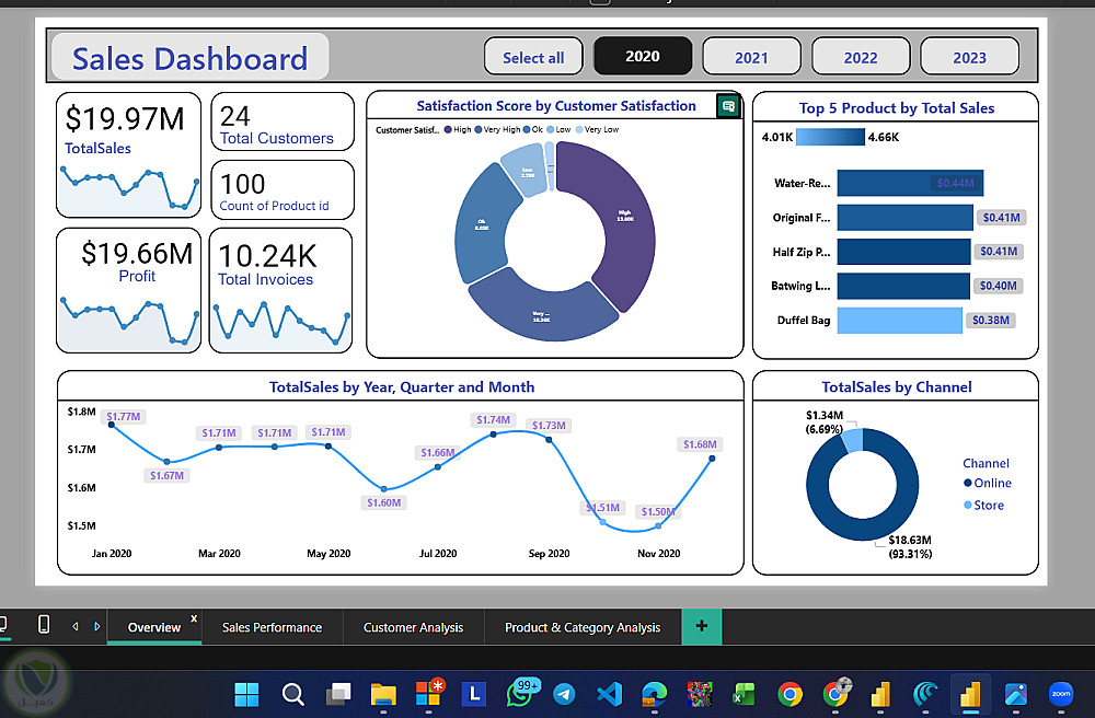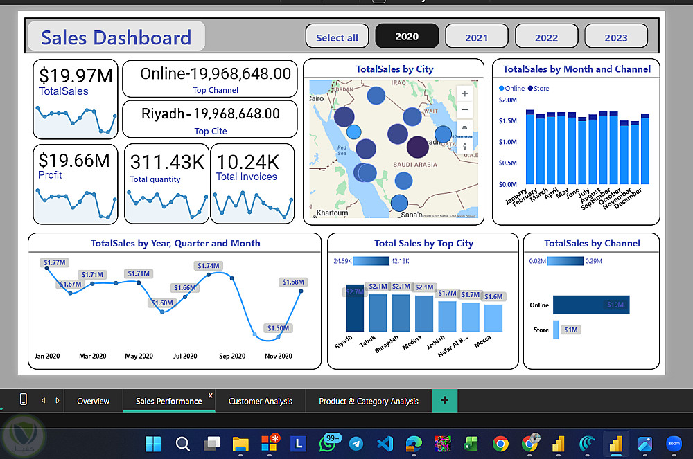 يتضمن التصميم سلايسرز للتصفية بحسب السنة وصفحات تحليلية مع مخططات خطية وعمودية ودونات وخرائط للمدن لإبراز القنوات والمناطق الأكثر مساهمة بطريقة تفاعلية وبديهية.