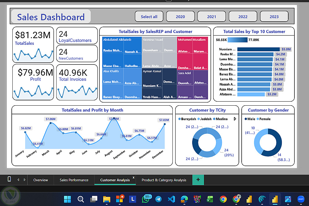 مشروع تطوير لوحة معلومات مبيعات عربية باستخدام Power BI لعرض مؤشرات الأداء الرئيسة مثل إجمالي المبيعات والربح وعدد الفواتير والعملاء مع اتجاهات زمنية وأعلى المنتجات أداءً في لمحة.
