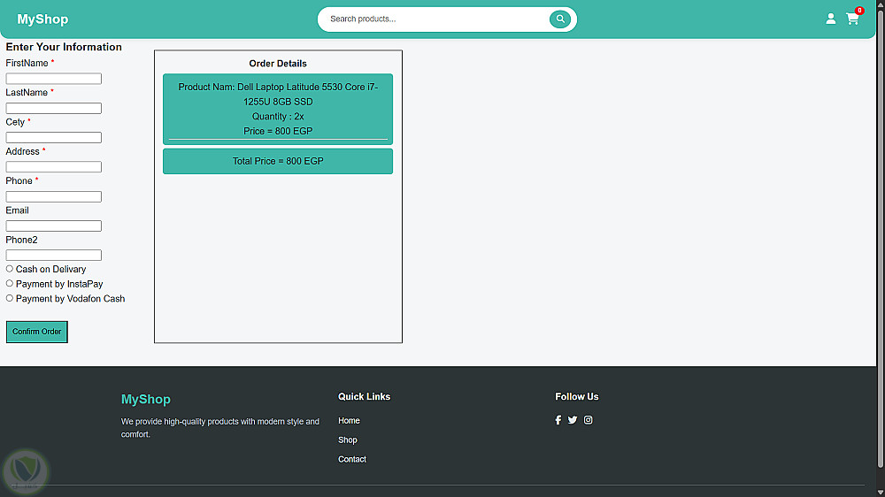 - صفحة إنهاء الطلب (Checkout): نموذج لإدخال بيانات العميل وعرض ملخص الطلب وطرق الدفع (نقداً عند الاستلام، InstaPay، فودافون كاش). (كما يظهر في Screenshot 76).