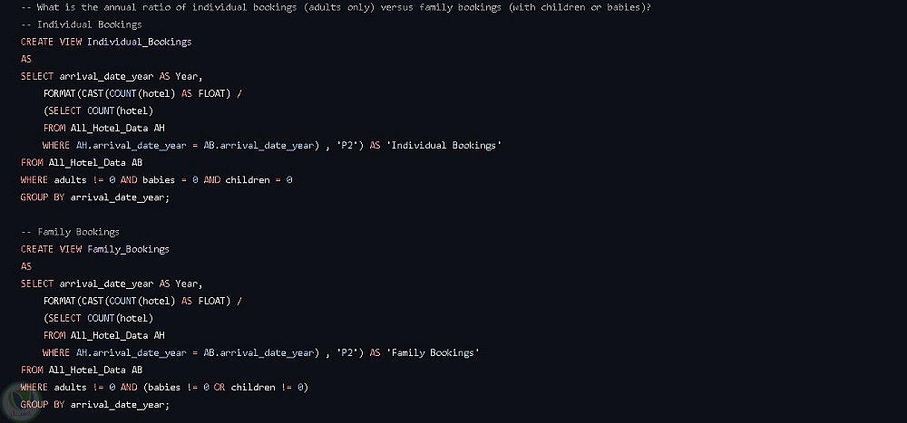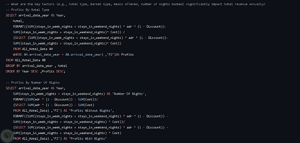 هذا المشروع يقدّم تحليلًا شاملاً لبيانات حجوزات الفنادق بالاعتماد على SQL، مع التركيز على اتجاهات الإيرادات، سلوك العملاء، تفضيلات الغرف، وأنماط الحجز عبر عدة سنوات.
