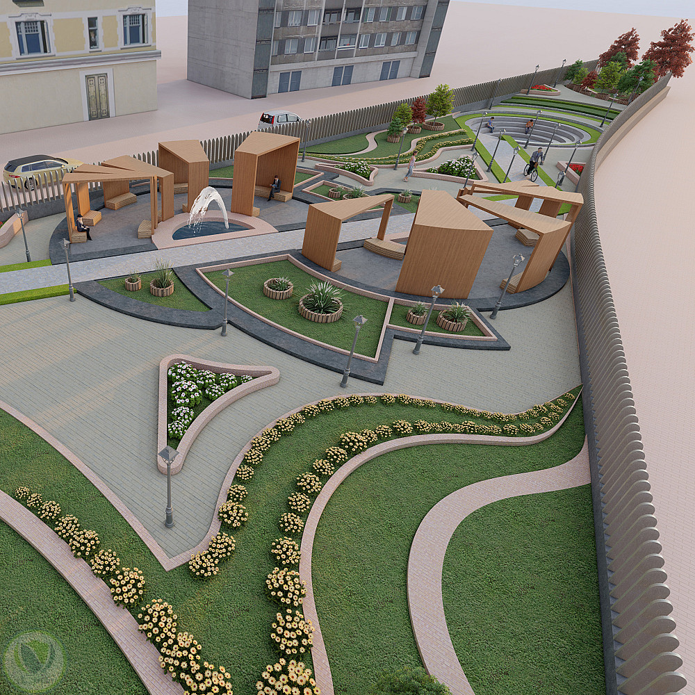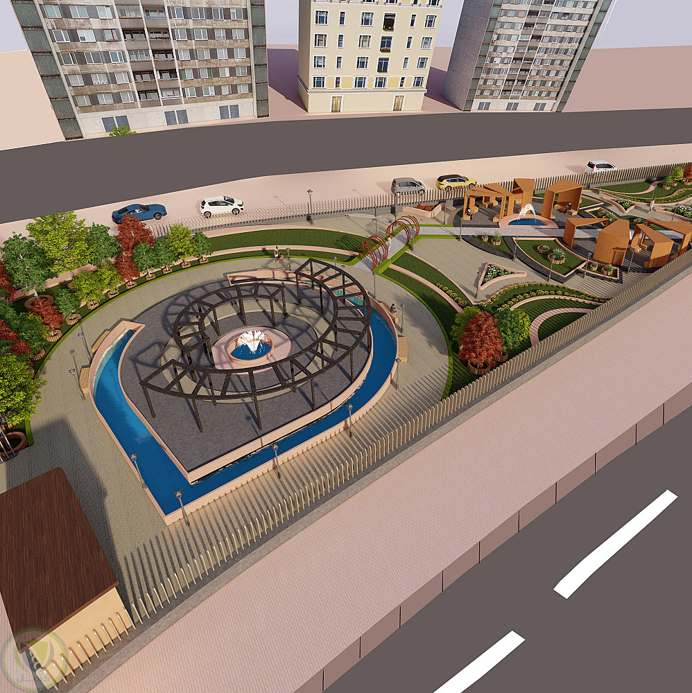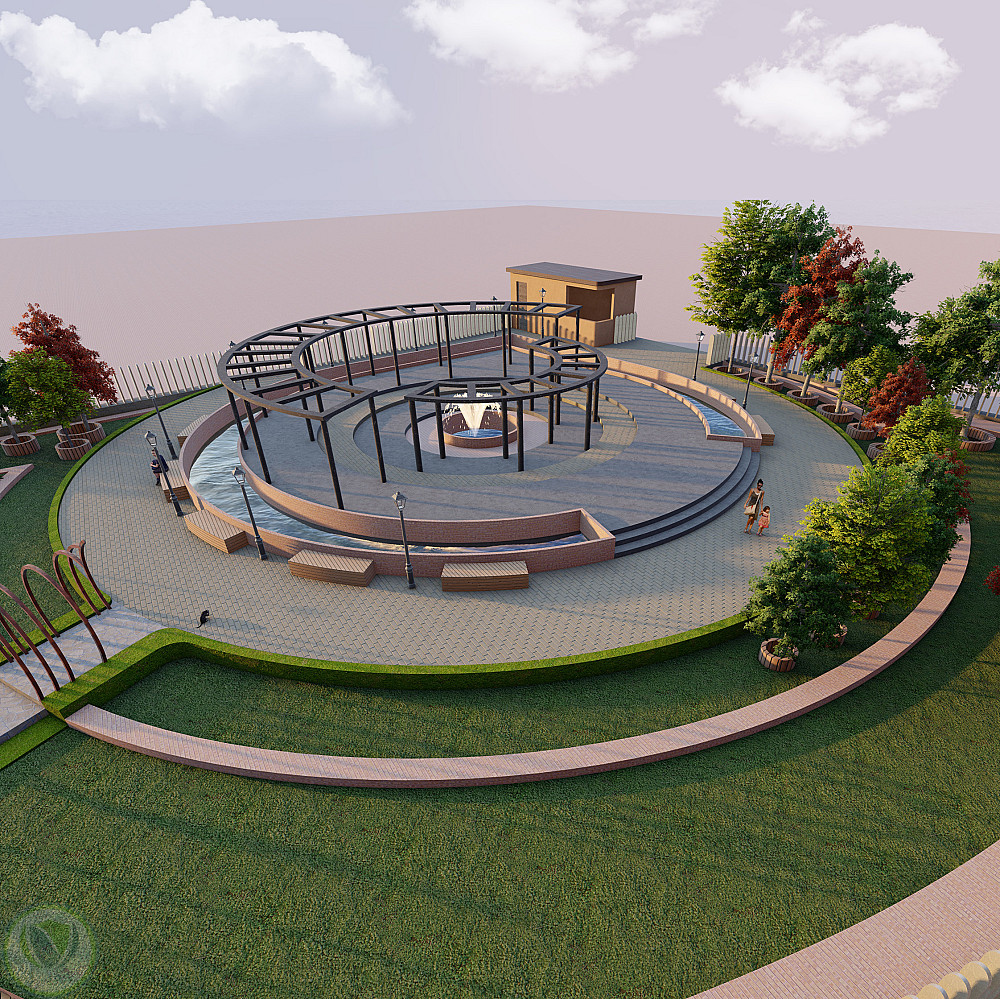 تصميم لاندسكيب لحديقة بطريقة الدوائر و المنحنيات لتعطي انسيابية للتصميم و تندمج مع الطبيعة