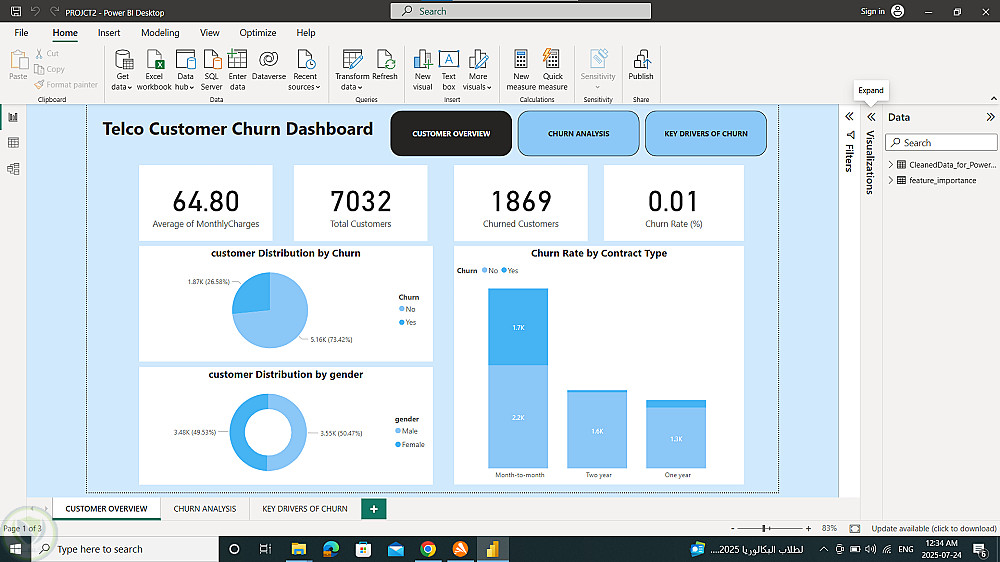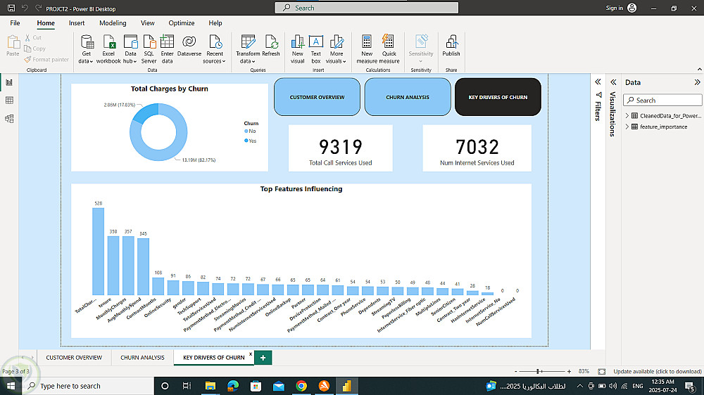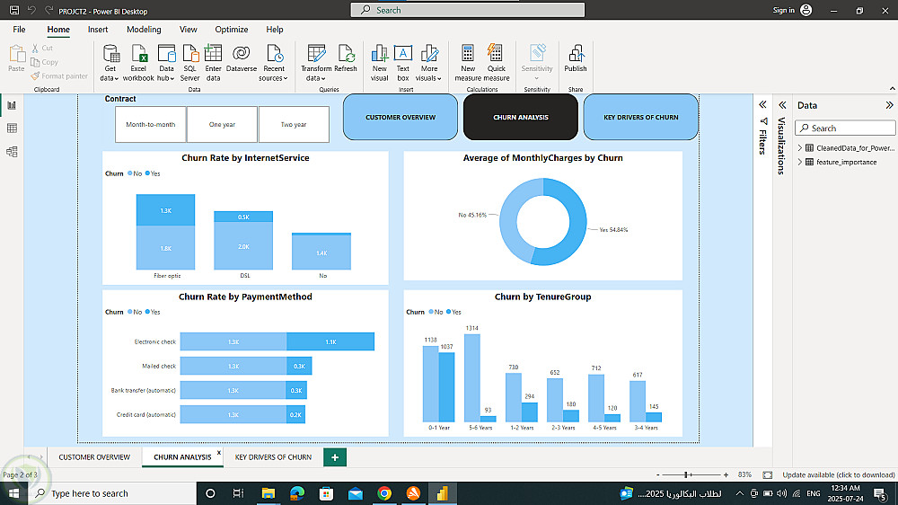 بعدها قمت بإنشاء Dashboard تفاعلي باستخدام Power BI يعرض رؤى واضحة تساعد متخذي القرار في فهم سلوك العملاء والاحتفاظ بهم.