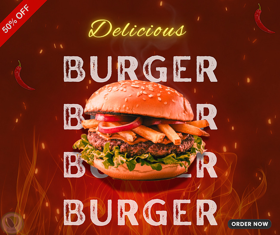 إعلان نابض بالحياة ومُشهٍ لبرغر، يتميز بخطوط عريضة وجريئة، وتصوير طعام فاتح للشهية، وعبارة واضحة تحث على اتخاذ إجراء. مثالي للحملات على وسائل التواصل الاجتماعي، أو العروض الترويجية للمطاعم، أو خدمات توصيل الطعام.