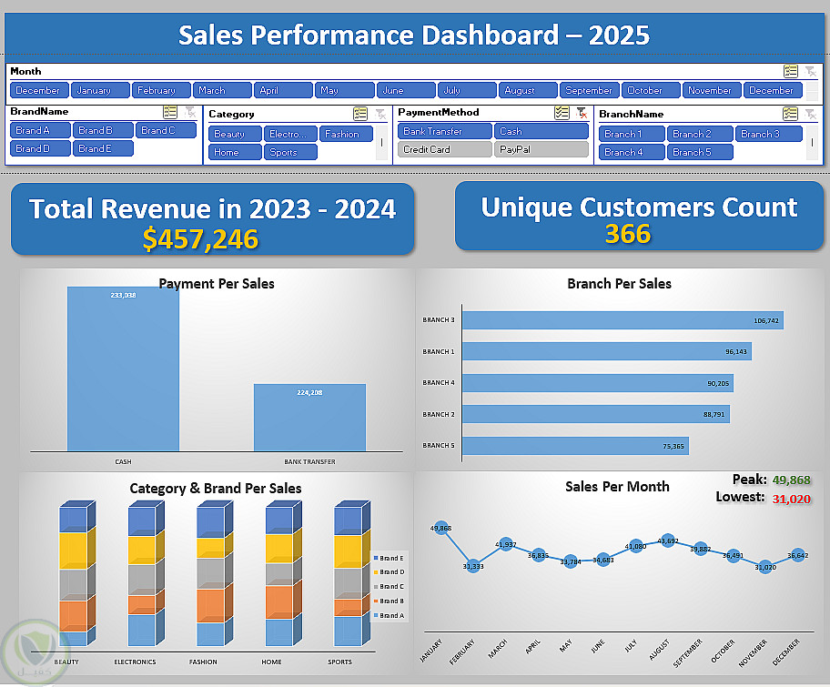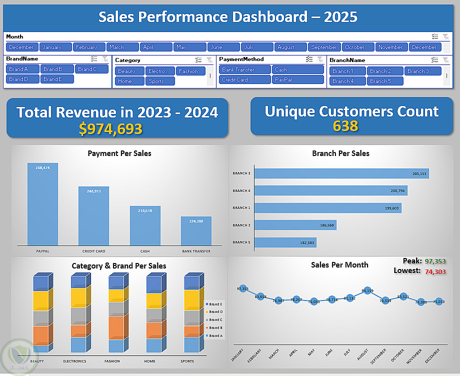 يسعدني مشاركة لوحة معلومات تفاعلية لتحليل وإدارة مبيعات 2023 و2024، مبنية بالكامل باستخدام Microsoft Excel وأدواته المتقدمة في التحليل والعرض البصري. 🎯 الأهداف: تقديم رؤية شاملة وفورية لأداء المبيعات، مع التركيز على إجمالي الإيرادات $974,693 وعدد العملاء الفريدين 638. تعرض اللوحة: الأداء الشهري (أعلى $97,353 وأدنى $74,303)، الإيرادات حسب طرق الدفع (PayPal، بطاقة ائتمان، نقدي، تحويل بنكي)، مقارنة الفروع، وتحليل الفئات والعلامات التجارية. 🛠️ الأدوات: Power Query لتنظيف البيانات، Power Pivot لبناء نموذج مترابط ومؤشرات أداء (KPIs) ,DAX، Pivot Tables & Charts لتلخيص البيانات مع Slicers لتسهيل التحليل.