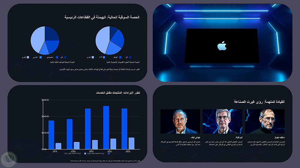 عرض شامل يسلط الضوء على تفوق Apple في الأجهزة والتطبيقات، مع مقارنة سوقية دقيقة. يتضمن رسمًا بيانيًا لنمو الإيرادات من الخدمات بين 2018 و2023، ويبرز الشخصيات القيادية التي شكلت مسيرة الشركة مثل تيم كوك وجوني إيف.
