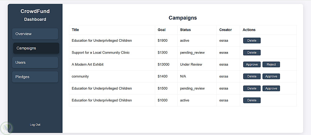 كان جزءًا أساسيًا من هذا المشروع هو تطوير لوحة تحكم للمسؤول (Admin Dashboard) لإدارة المستخدمين والحملات.